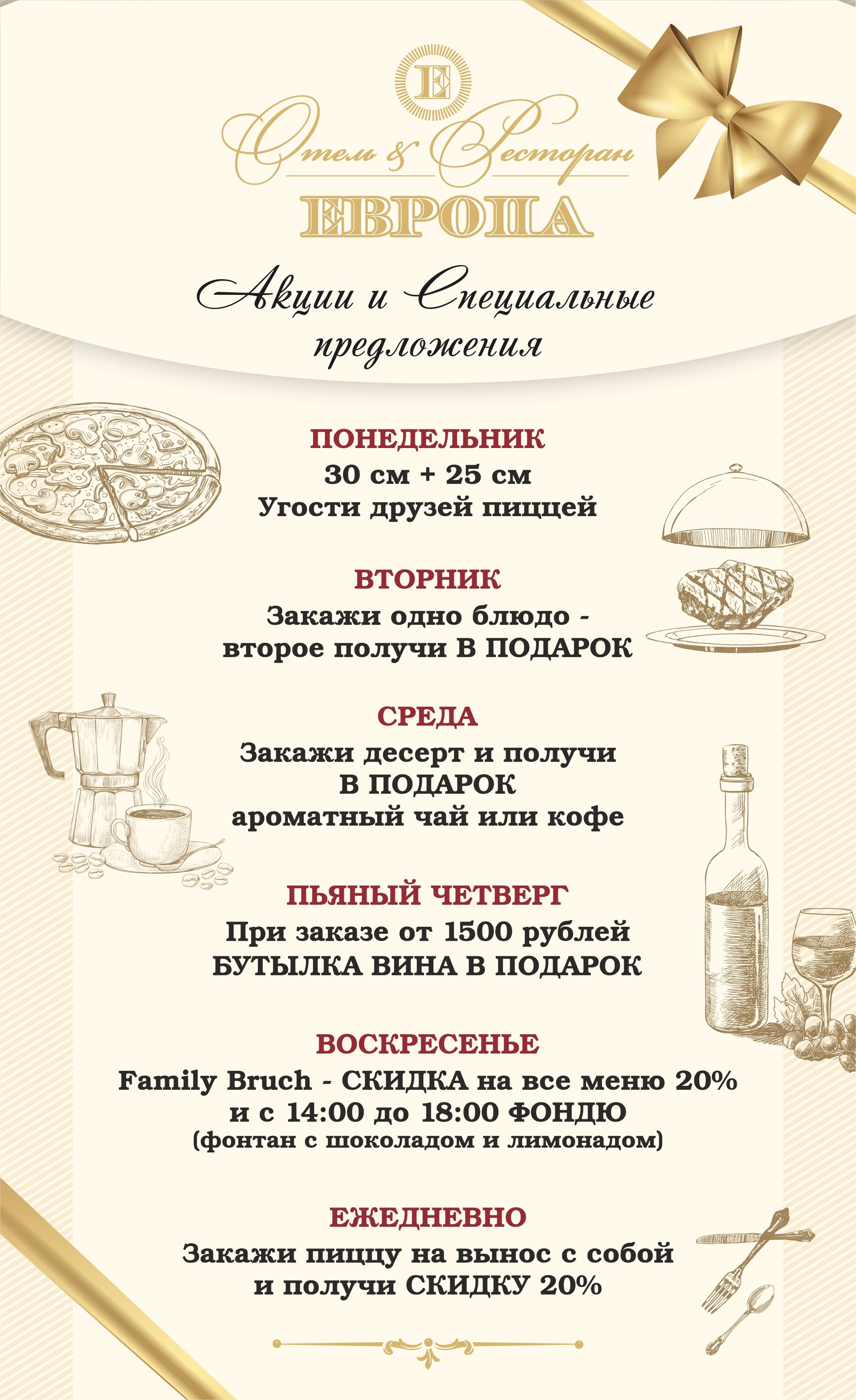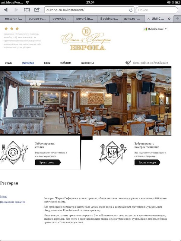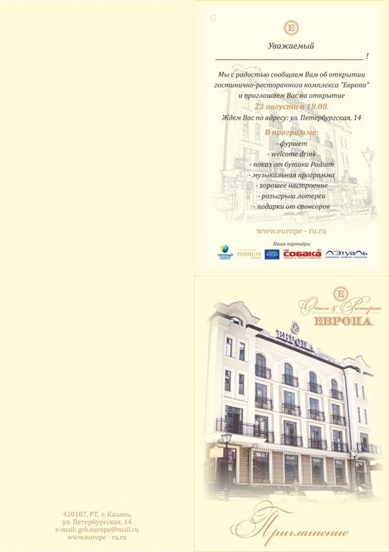 Если Вы хотите провести приятный вечер в красивой обстановке, с вкусной кухней, послушать саксофон, скрипку и прекрасный вокал, потанцевать, приходите в ресторан Европа! Вы получите большое удовольствие! (Только обязательно уточнить по телефону, будут ли музыканты)».